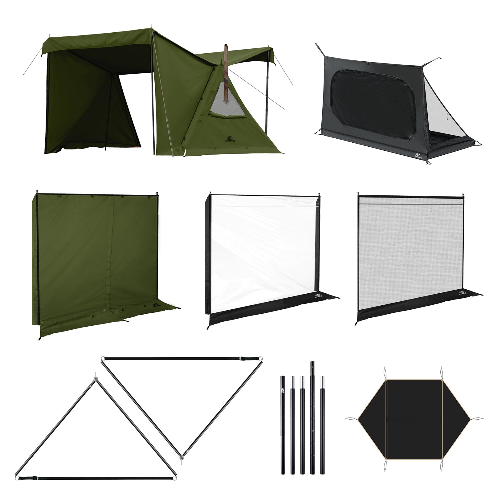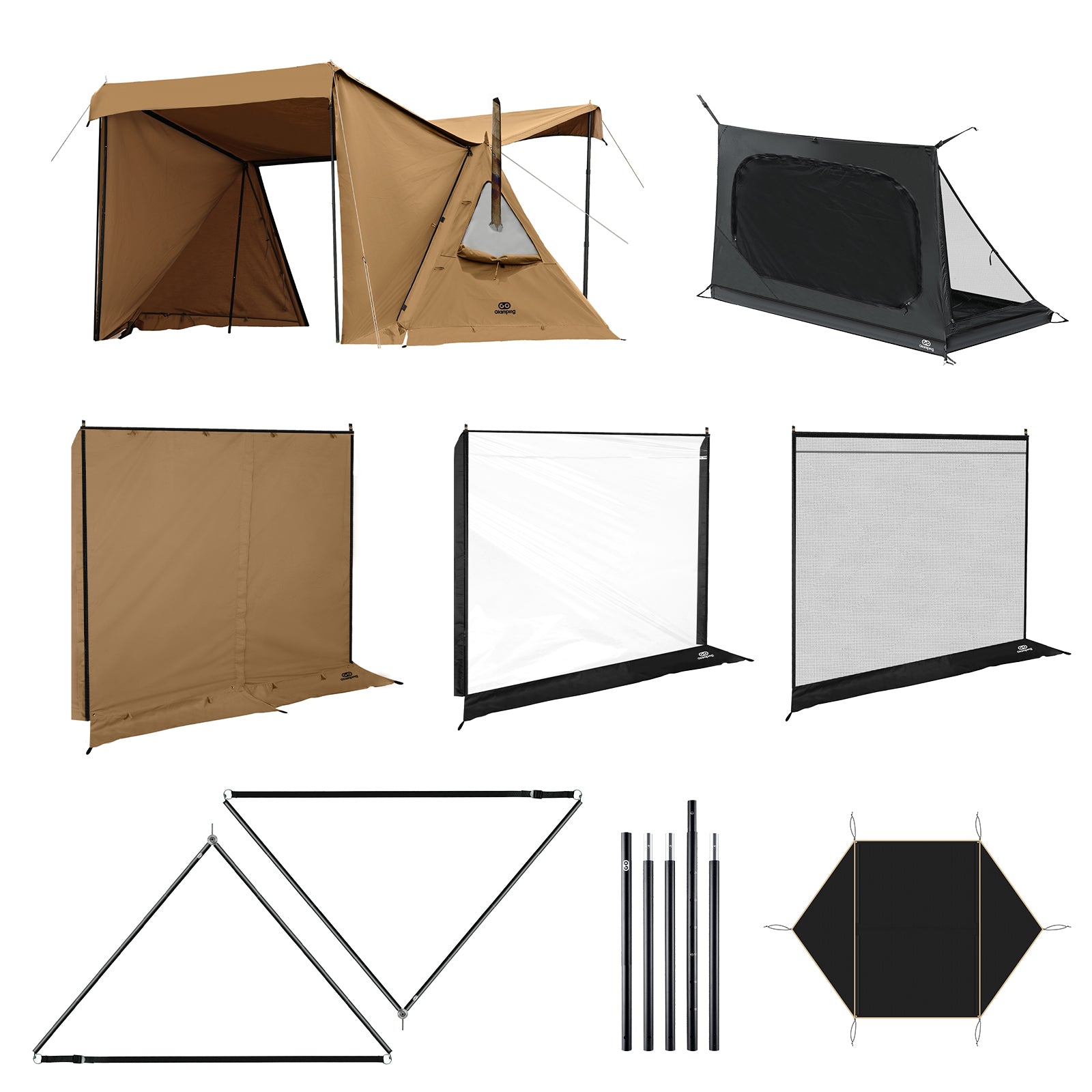 オプション品「TC前幕」を連結して、プライバシーを守りながら、パップテント内部の空間も広くなりる。サイドウォールとTC前幕にもジッパーを配置しており、出入口にすごく便利です。TC前幕にはポールとガイロープを合わせて、様々なスタイルを設営できます。