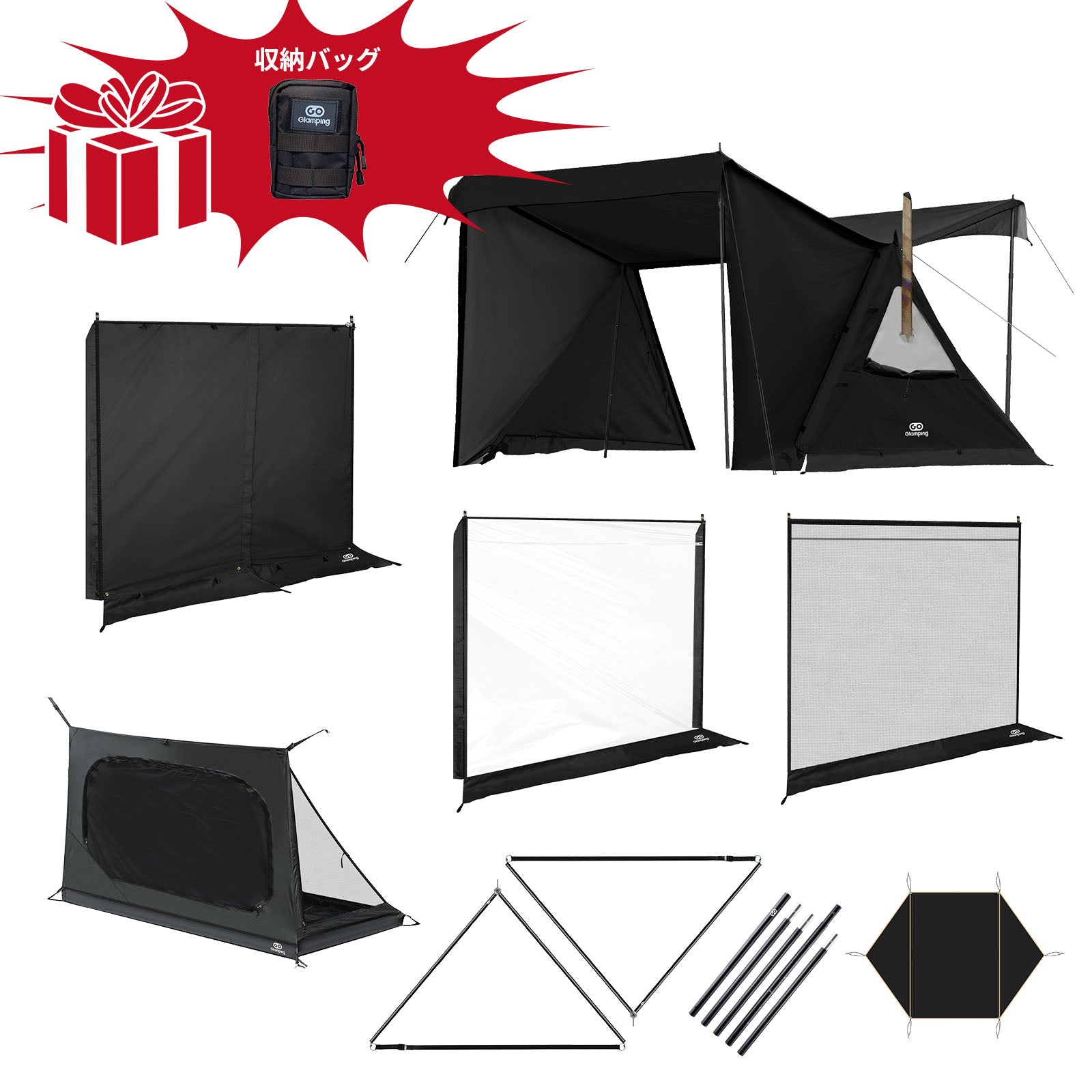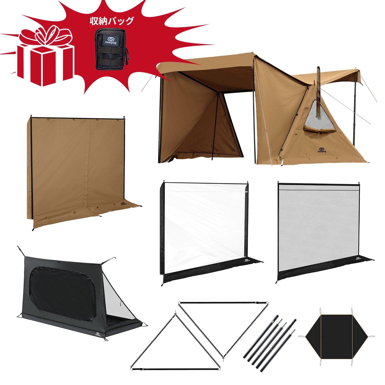 オプション品「TC前幕」を連結して、プライバシーを守りながら、パップテント内部の空間も広くなりる。サイドウォールとTC前幕にもジッパーを配置しており、出入口にすごく便利です。TC前幕にはポールとガイロープを合わせて、様々なスタイルを設営できます。
