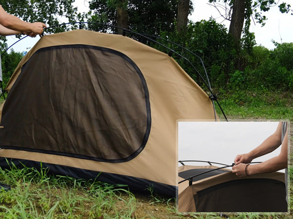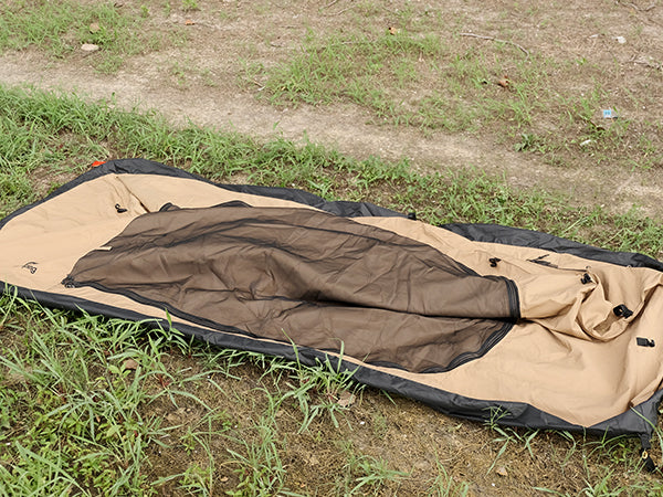 前後ドアは2層の生地(メッシュ+TC素材)で、必要に応じて、前後や片面のTC素材を開いて巻くことが可能です、蚊の侵入を防ぎ、通気性も良く、夏キャンプにも涼しく過ごせます。