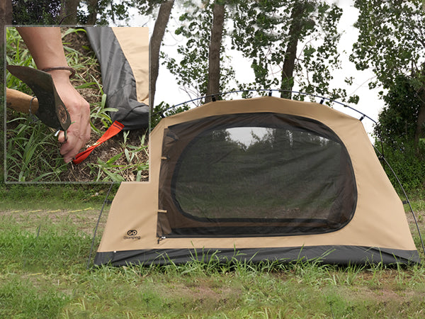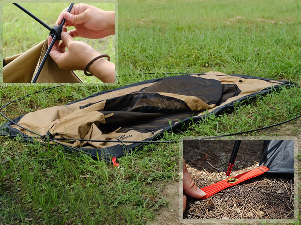 こちらも前後を逆にしたアレンジです。ポールを用いて前室を支え、残りの三つのベルトをペグダウンします。この魅力的なスタイルはGOGlampingファンから名付けられました。後方に飛び出た三角部分を中へ入れれば、荷物おきばになります。